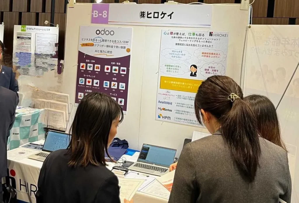 当日は、健康経営に役立つ「パーソナルスコア(身体年齢)」の測定体験や、ヘルスケアソリューションのご紹介、さらに業務改善をご支援するクラウドERP「Odoo(オドゥー)」のデモを実施いたしました。