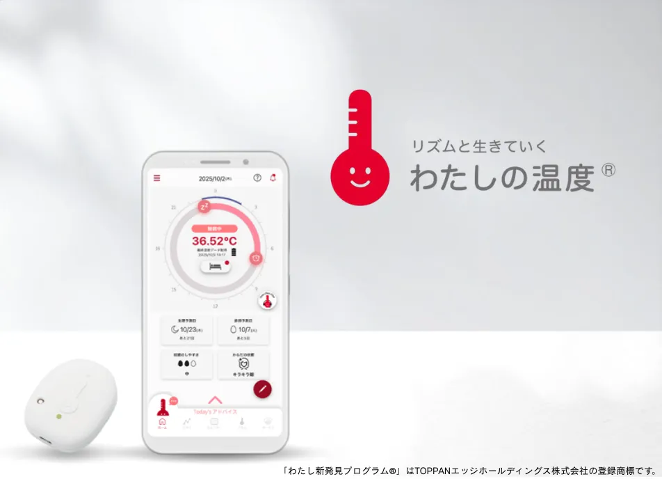 働く女性が抱える健康課題の把握から改善支援までをワンストップで提供し、女性活躍推進とパフォーマンス向上につなげる企業向けの健康経営・フェムテック支援サービスです。基盤となる「わたしの温度®」は、女性特有の体調リズムを自動計測し、研修・医療相談と組み合わせることで、働く女性の健康課題を包括的にサポートします。